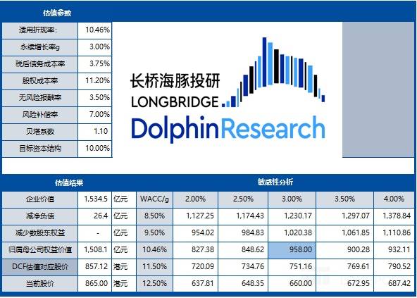 海豚君刚才说的老铺这种特殊原材料生意的问题,也影响到了对于公司自由现金流的估算。如何看到这个问题: a.考虑到黄金作为存货,虽然和其他企业把黄金作为现金的一种理财工具有本质不同。黄金在总资产中占比太高,黄金价格波动必然影响公司业务,因此也就是上篇说的,无论黄金界爱马仕如何影响,当前毛利率水位下的它,脱离不看黄金的地心引力,而当前黄金价格高本身也是公司业绩助长因素之一。 这个问题对估值的启示是,由于业绩增长模型都偏线性预测,无法预判黄金周期,因此在金价高点时候,很容易乐观线性外推公司的业绩长大性,对实际算出来的估值其实要打一定金价的周期性折扣。而当下黄金就处在这样一个上行周期当中。 b. 黄金作为存货的特殊性在内,它的流动性极强,比亚迪现金流断裂了,工厂资金一定程度上就是破铜烂铁,但黄金无论如何它就都是相对高流动高保值的资产。因此海豚君对这个公司的 DCF 估值是以税后经营利润(NOPAT)为基础,而非自由现金流。而自由现金流上,因为公司在业绩上行期,利润全部转化为黄金库存,自由现金流反而为负数,无法做 DCF 估值。 五、老铺还有价值吗? 从相对估值的角度,因为公司为长大股,2025 年 PE 为 51 倍,看起来非常夸张;但即使公司还有不错的长大性,以当年利润的估值倍数来体现也不太合适。 所以海豚君在做 PE 估算时,按照海豚君所判断的公司进入稳定增长时的税后经营利润,参考当前同行的成熟期估值来做 PE 估值。 具体来说:在海豚君的判断中,按照 29 年稳定大约接近百亿的税后利润为基础,而届时公司的利润增长在 20%,给与 2029 年利润 20X 的 PE(对比当前成熟期同行普遍 15 倍上下的 PE),再按照海豚君 DCF 估值中的 WACC=10.5% 来折回到 2025 年,对应 2025 年 PE 估值 1400 亿港币,比当前价格还要低上 8% 上下。 从绝对估值的角度,假设 WACC=10.5%,永续增长率 3% 的情况下 DCF 测算出的老铺黄金的股价为 958 港币,也就溢价了 8%。 也就是说,两种估值方法综合下来,在当前的价位上,老铺的投资价值并不高。