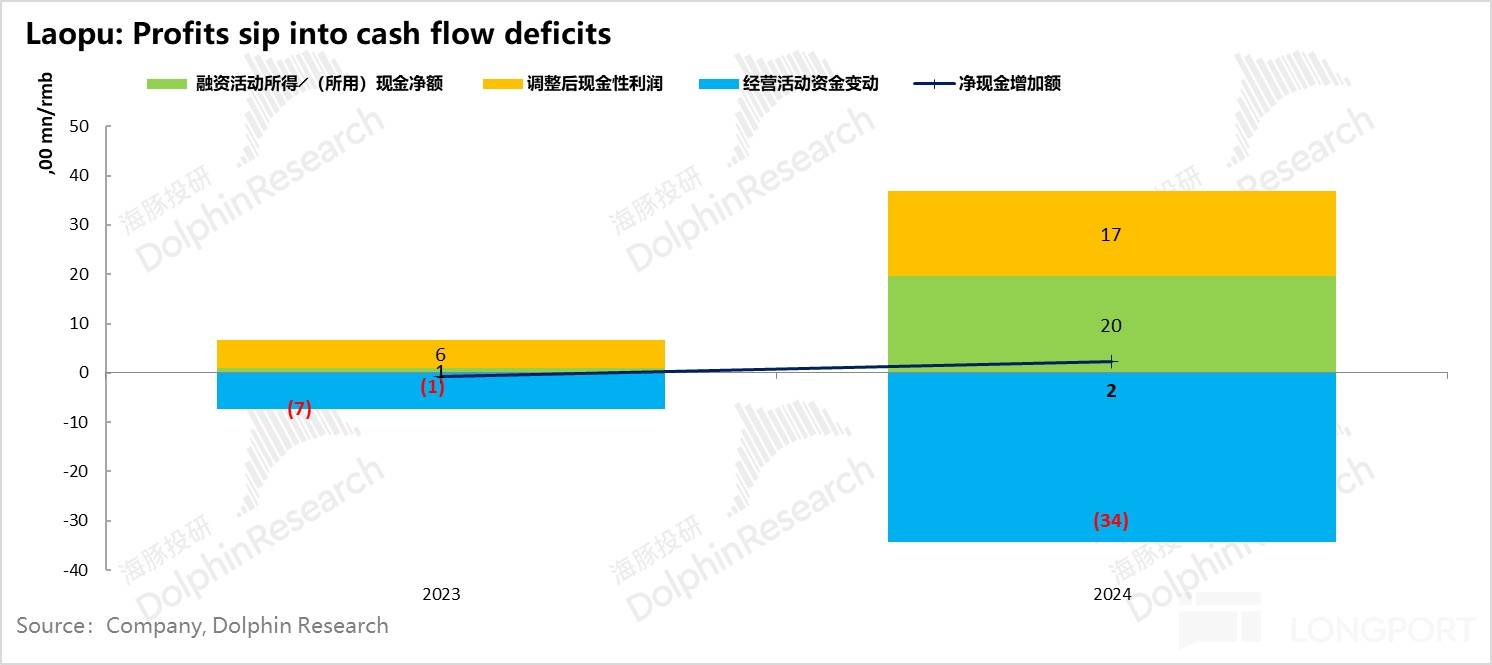 四、谈投资价值前澄清一个关键问题:黄金存货如何看待? 这里特别提醒一下,由于上篇说过了,它无论如何用奢侈品来营销和定义自己,但实际上老铺还是一个与原材料黄金的价格高度相关的生意。 应上篇中用户的留言,在这里也特定用现金流解密的方式,来说明为什么海豚君一再强调它与金价周期高度挂钩,它无法像其他奢侈品脱离原材料价格独立控制商品价格,还是摆脱不掉黄金原材料的价格波动。 从下图中可以看到:2024 年公司调回股权激励、摊销折旧后实际现金性利润基本是在 17 亿元,但经营活动却实际消耗掉了 34 亿元,中间是 17 亿的运营窟窿。 最终勉强能能获得 2 亿的现金增加额,主要是因为 24 年公司把 IPO 上市融到的 9 亿人民币,加上公司净借款了 13 亿元,才算是把这个 17 亿运营的窟窿补上。